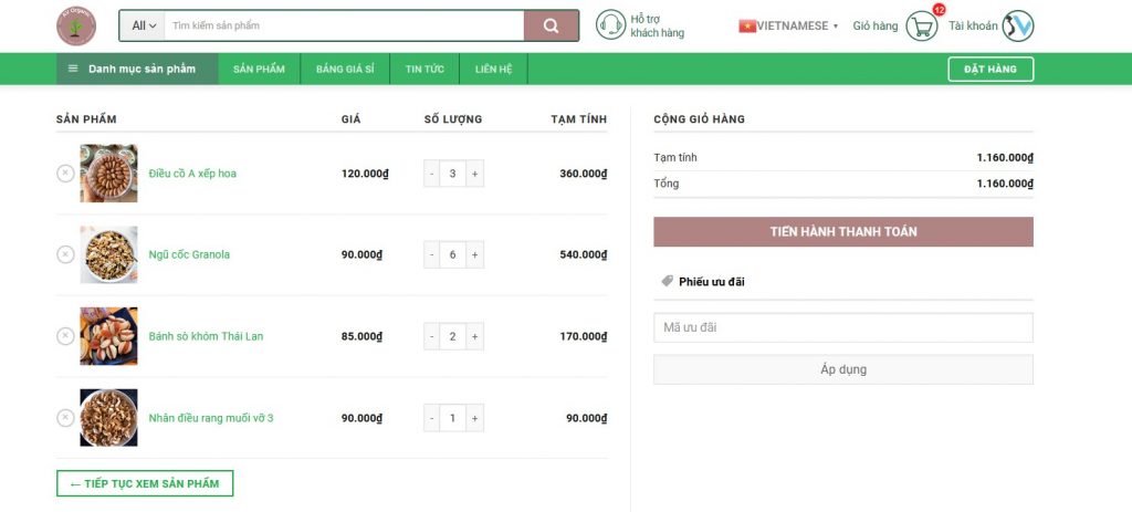 Sau khi quý khách đã có đủ sản phẩm cần đặt trong giỏ hàng, nhập mã giảm giá(nếu có) và tiếp tục các bước sau để đặt hàng: